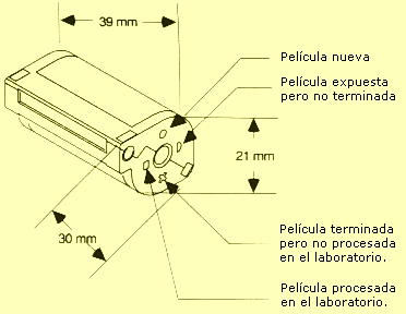 La película APS permite sacar una película sin acabar y continuarla en cualquier momento, a diferencia de la película tradicional de 35mm. En el lateral del carrete APS encontraremos unas muescas que indican el estado de la película, que puede ser. | |||