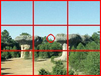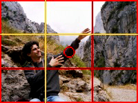 Según la división por tercios de una escena, la confluencia de los tercios marcan unos puntos donde se hacen llamativos los objetos, llamados puntos fuertes. El centro también es un punto fuerte. Es recomendable hacer coincidir los objetos con estos puntos. |
